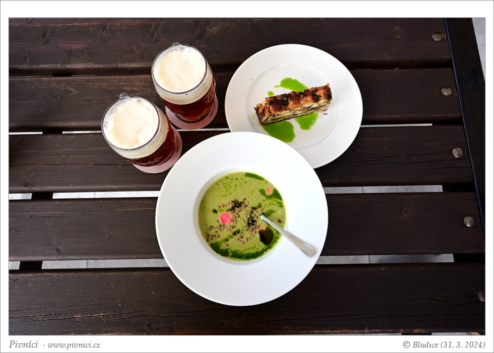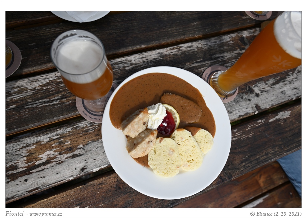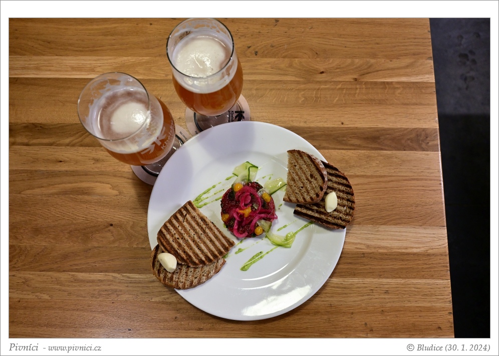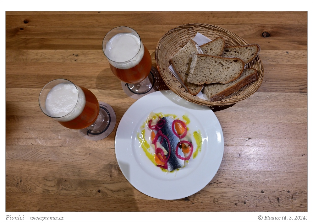 Menší i větší jídla, denní menu, česká i mezinárodní kuchyně. Ceny průměrné. Jednou jsme si dali svíčkovou, byla výborně ochucená, maso se rozpadalo na jazyku. Při jiné návštěvě jsme zkusili lasagne a konfitovanou hovězí plec s pepřovou omáčkou, obojí bylo to moc fajn. A při příští jsme ochutnali vepřovou pečeni s liškovou omáčkou a šťouchanými bramborami i tandoori steak s chipotle dipem a americkými bramborami. I to bylo velmi dobré. Z menších jídel jsme zkusili třeba chutnou gulášovou polévku, bezva doma marinovaného sledě nebo svěží moderní tatarák s toustovaným chlebem, nakládanými kyselými okurkami a cibulí. Dále pak bezva krém z medvědího česneku s ředkvičkami a praženým sladem i hezky ochucenou velikonoční nádivku.Pivo (3 - dobré):