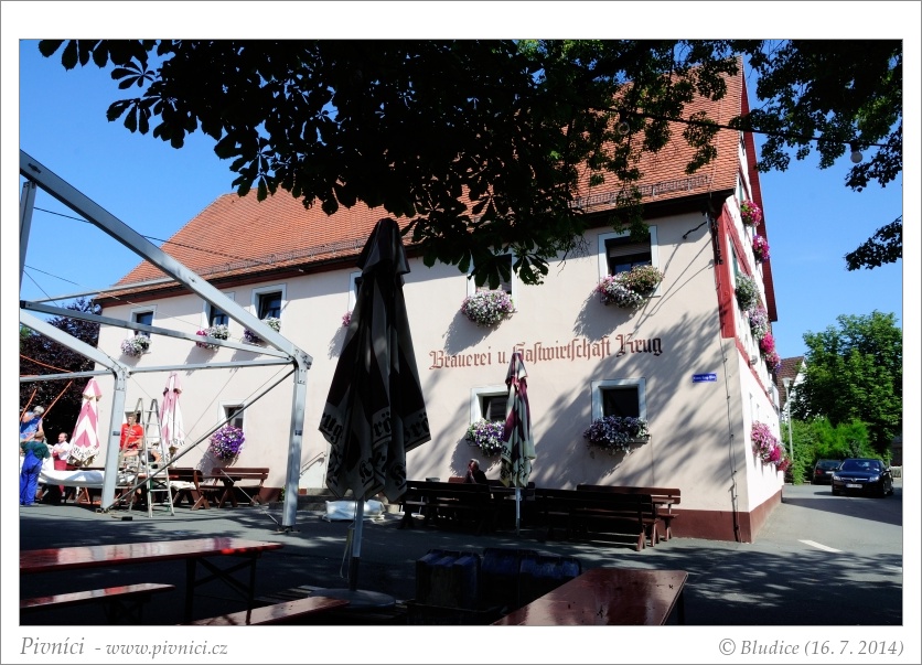 Pivovar nacházející se uprostřed vesnice, naproti němu je restaurace a penzion. Vše je hezké, takové novější či pěkně opravené. Před restaurací je pár stolků, další zahrádka je kousek dále ve stínu kaštanů. Dále je větší zahrádka s mnoha stolky a lavicemi před pivovarem, přímo pod oknem s varnou. Jen tam svítí sluníčko, možná ale při větším počtu návštěvníků vytáhnou slunečníky. Restaurace uvnitř je fajn, taková franská klasika. Celkově moc fajn prostředí.Obsluha (3,5 - velmi dobré):