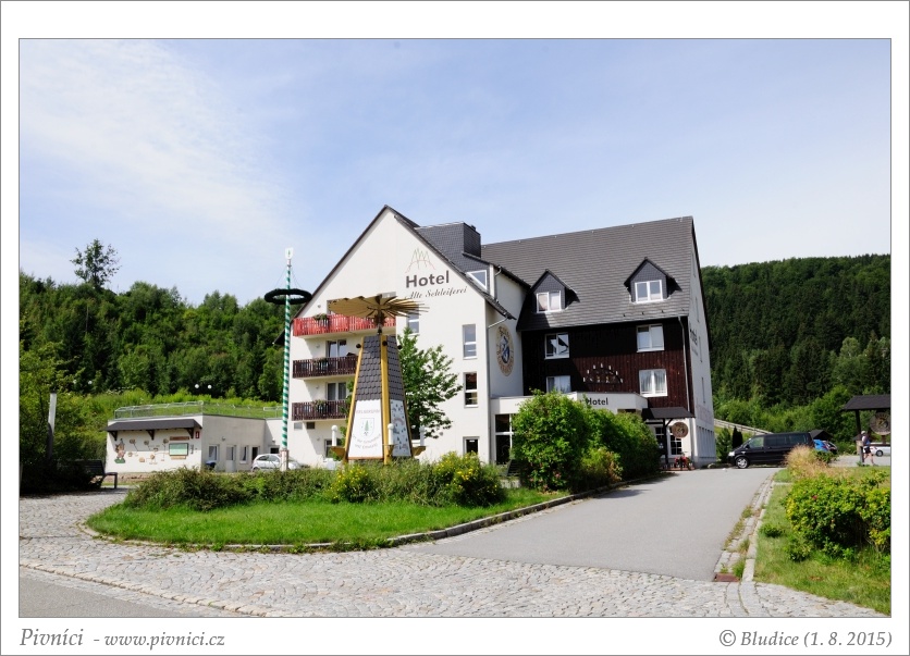 Hotel s restaurací a pivovarem na kraji vesničky (na německé straně Krušných hor). Restaurace je taková klasicky zařízená, s dřevěnými stoly, najdete tu i měděnou varnu pivovaru. Venku za hotelem je pěkná zahrádka ve stínu slunečníků.Obsluha (4 - výborné):