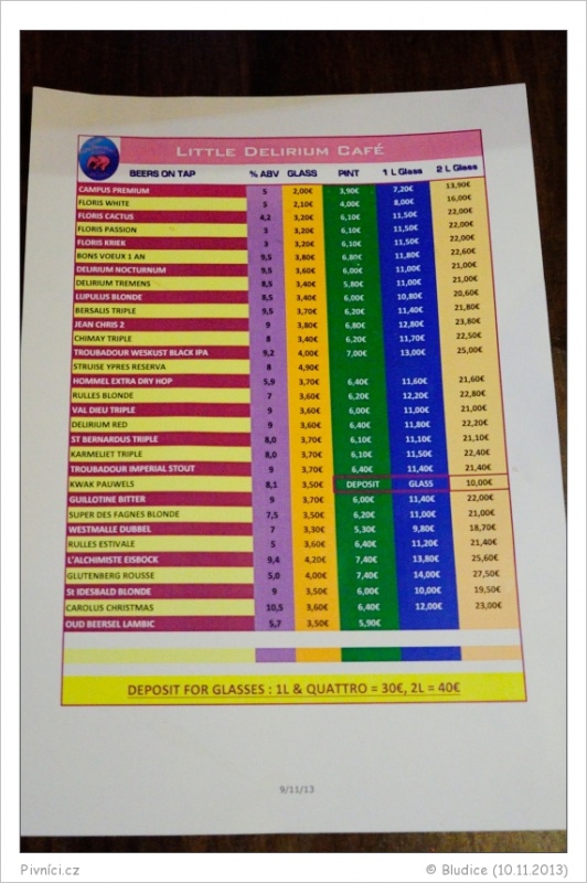 31 píp, z toho necelá půlka průmyslové kousky a zbytek jsou zajímavé věci z malých pivovarů či netradiční piva ze středních pivovarů, sem tam i slušná raritka. Ceny možná lehce vyšší, vzhledem ke kvalitě piv spíše průměrné. Je možné dát si ochutnávku 3x necelých 2 deci za 6 €.Celkový dojem (8 - výborné):