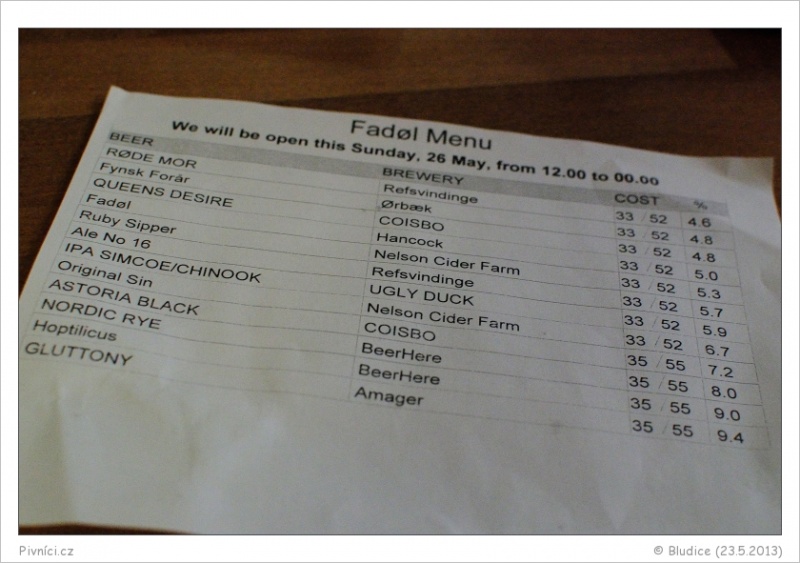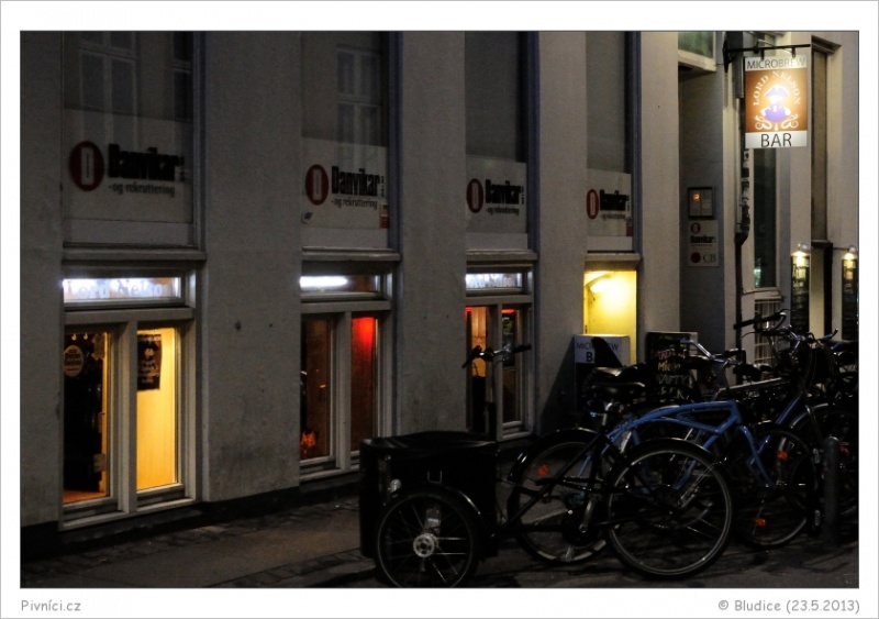 Velký výběr dánských piv z malých pivovarů, různé IPA, Bittery, Imperial Stouty a tak podobně, celkem deset (rotujících) píp. K tomu dvě pípy z místními Cidery. Ceny jsou takové spíše průměrné, za pivo s 10% alkoholu zaplatíte skoro stejně jako za lehký ejl, dokonce snad ve výsledku méně, než u nás.Celkový dojem (7,5 - velmi dobré):