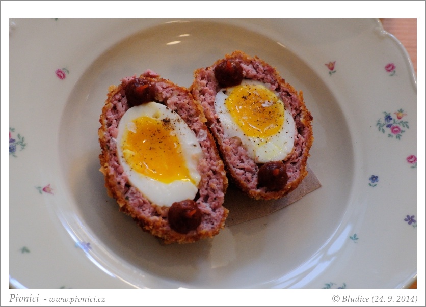 Jednoduché menu o pár položkách a pár denních specialit navrch. Ceny jsou trošku vyšší. Ochutnali jsme skotská vejce, byla krásně šťavnatá s moc příjemnou chutí masa, jemně kořeněná / peprná. Prostě slast. Sendvič s klobáskami, čedarem, vejcem a jemným toustem byl chutný a hodně zasytil.Pivo (3,5 - velmi dobré):