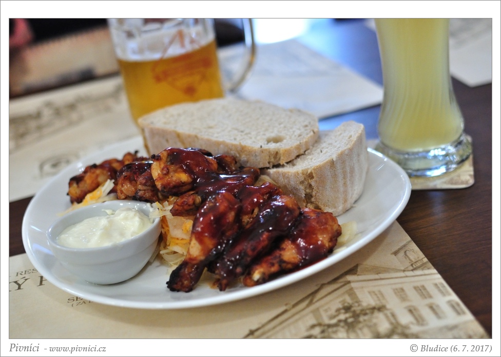 Všemožná zajímavě vypadající velká jídla, steaky, kolena, tatarák, též i chuťovky k pivu. Ceny lehce vyšší. Dali jsme si „předkrm“ – křídla se zelím a domácím chlebem, bylo to chutné a bylo toho tolik, že jsme to měli problém ve dvou sníst.Pivo (3,5 - velmi dobré):