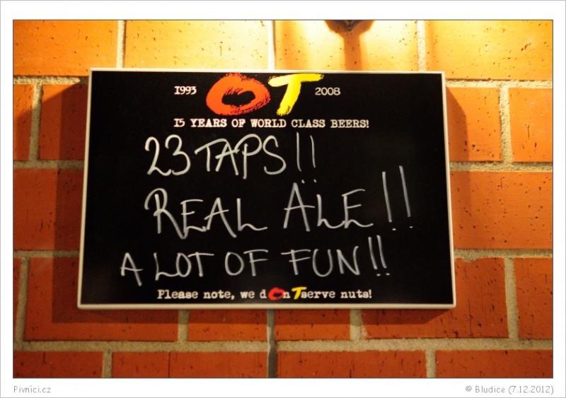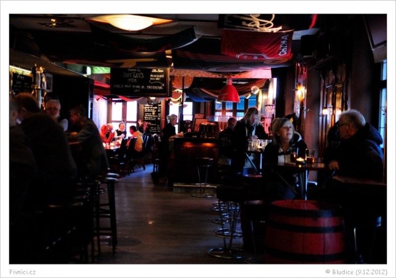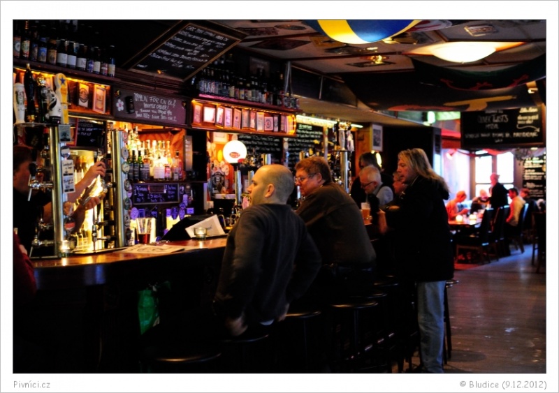 Anglický pub celý obložený dřevem, zdobený rozličnými vlajkami a pivními cedulemi. Hezký bar s mnoha pípami na vysokých stojanech.Obsluha (4 - výborné):