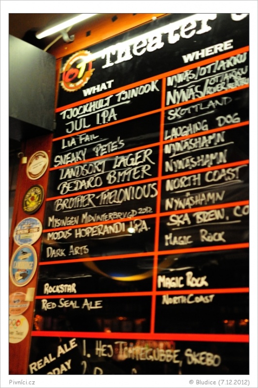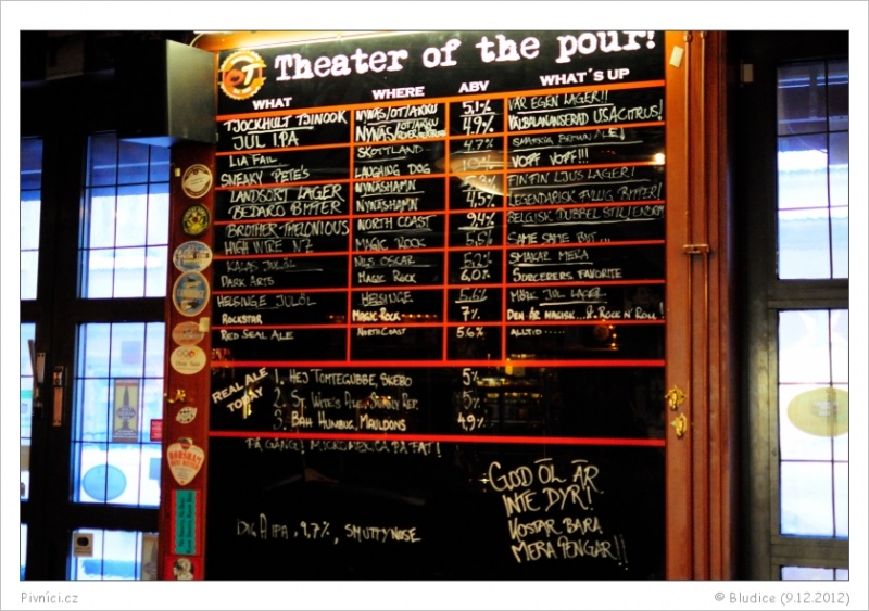 Tři real ale z casku a dále 14 klasických píp, všechno piva z malých švédských pivovarů, plus pár zahraničních luxusních kousků.Celkový dojem (9 - výjimečné):