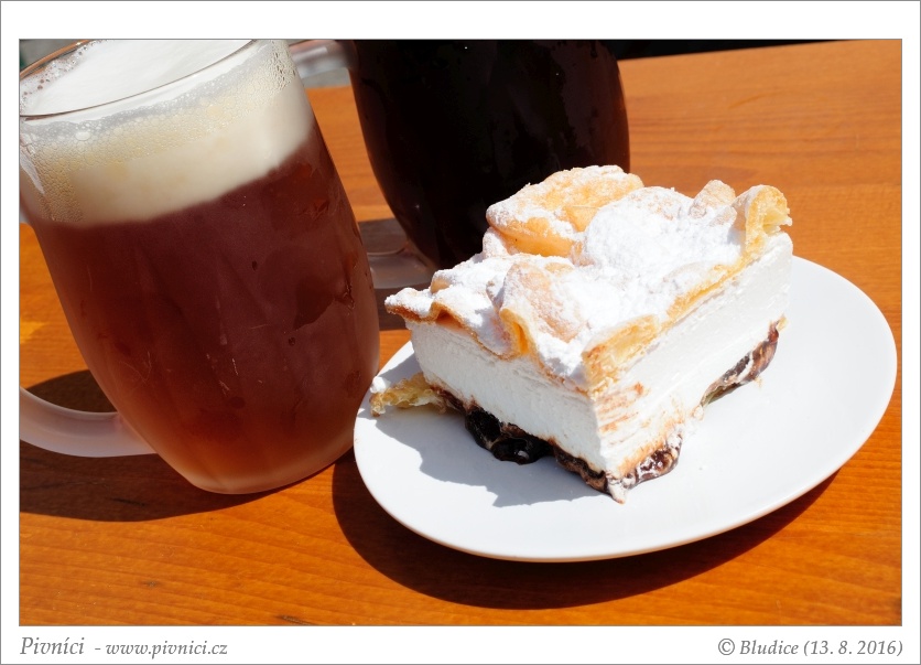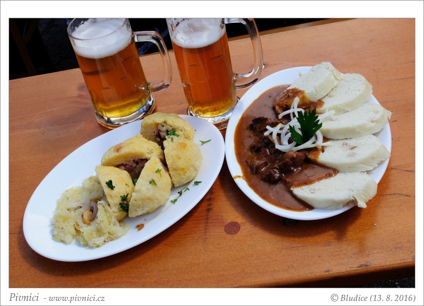 Výběr z mnoha hotovek, vesměs klasická česká jídla. Ceny lehce vyšší. Dali jsme si hovězí pivní guláš, byl výborný, maso se rozpadalo na jazyku, a knedlíky se zelím, plněné uzeným masem, trochu sušší, ale fajn. Pak ještě Povidloně jako zákusek, chutný odpalovaný dortík s povidly.Pivo (4 - výborné):