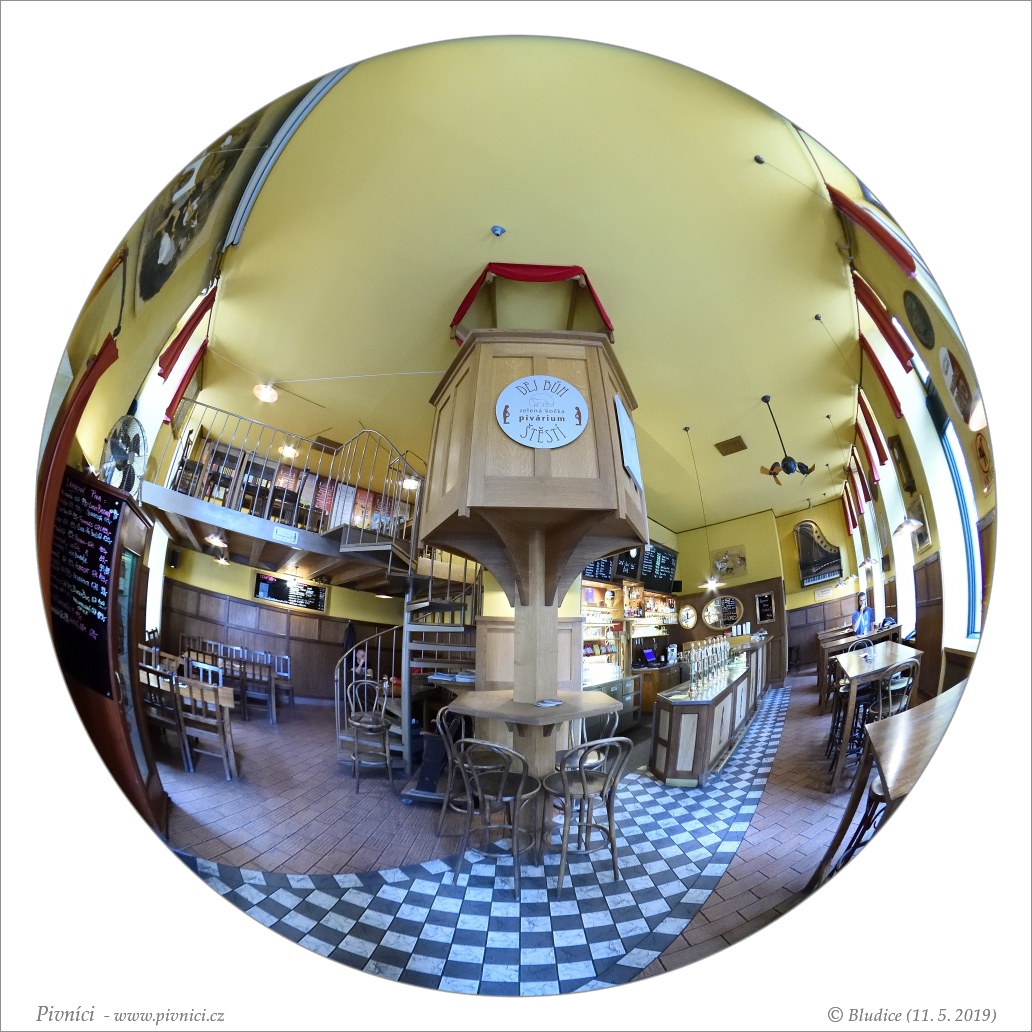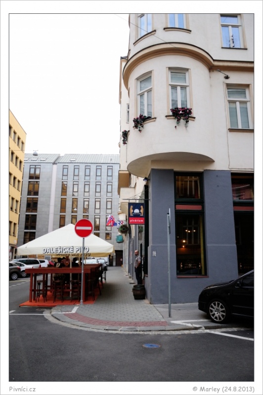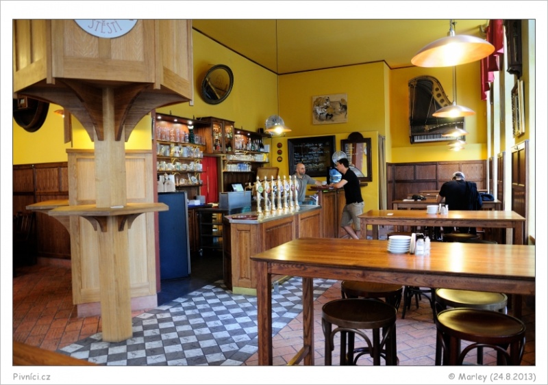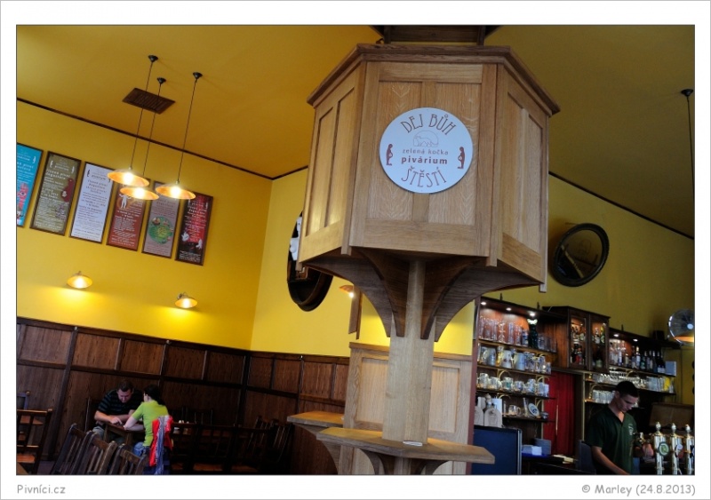 Pěkná hospoda v centru na rohu ulice, venku je fajn zahrádka. Uvnitř je to moc pěkné, moderně zařízené, dřevem obložené, pozlacené pípy. Trošku pompézní, nicméně stejně pěkné.Obsluha (2,5 - lehce nadprůměr):