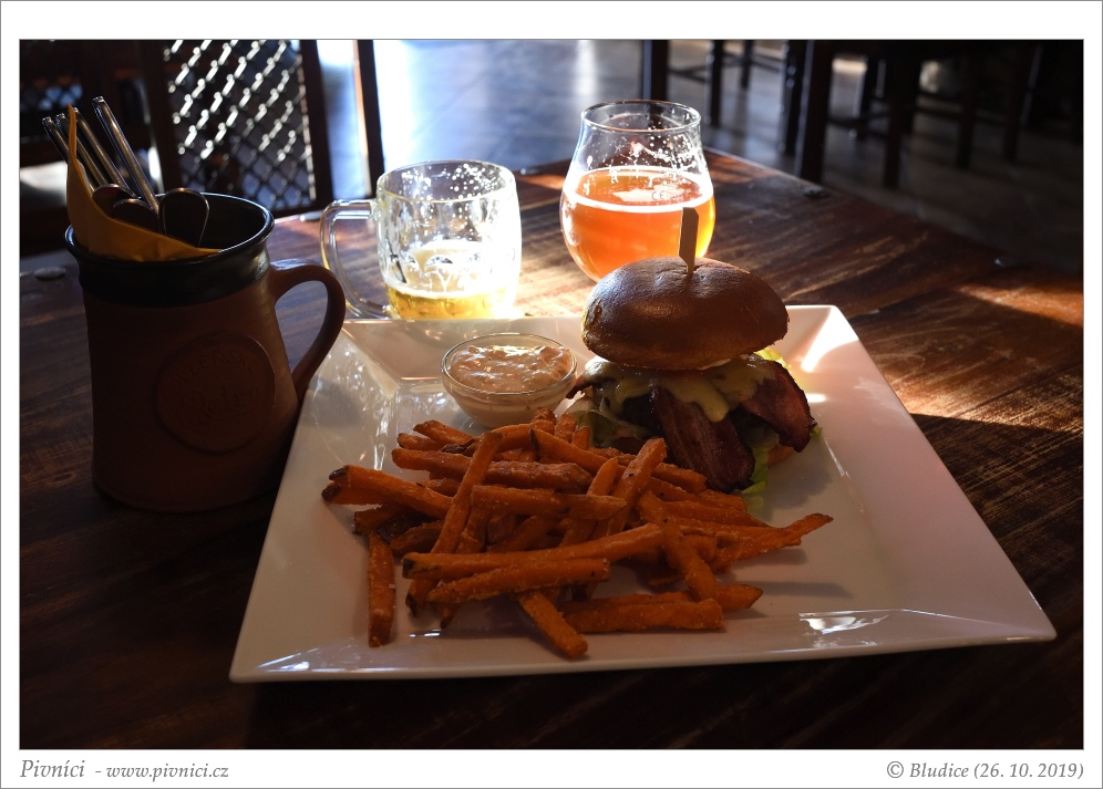 Mnohé menší pochutiny k pivu i řada hlavních jídel. Ceny průměrné. Dali jsme si burger s batátovými hranolky a uzenou majonézou, bylo to velmi chutné, šťavnaté maso a fajn bulka.Pivo (3,5 - velmi dobré):