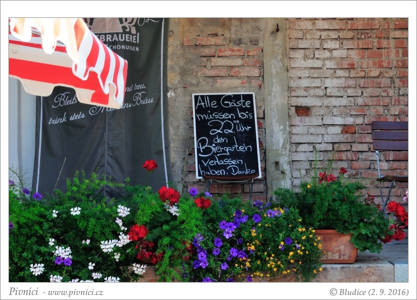 Pivovárek s restaurací a zahrádkou ve vesnici kousek od Schweinfurtu. Je v pěkných starých budovách, zahrádka je vzadu za nimi. Zahrádka je pěkná, na svahu kopce, obrostlá růžemi a dalšími rostlinami, ve stínu několika stromků a slunečníků. Moc příjemné posezení s výhledem na pivovarský komín a okolní kopce.Obsluha (3,5 - velmi dobré):
