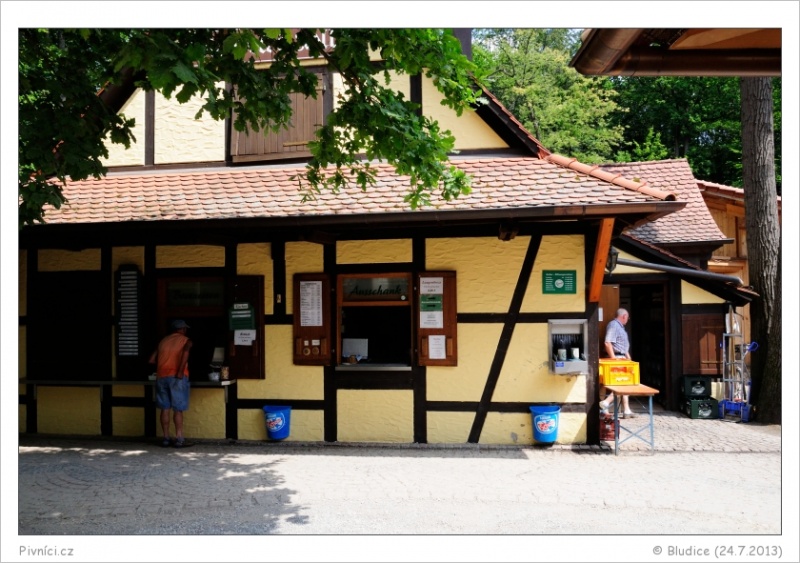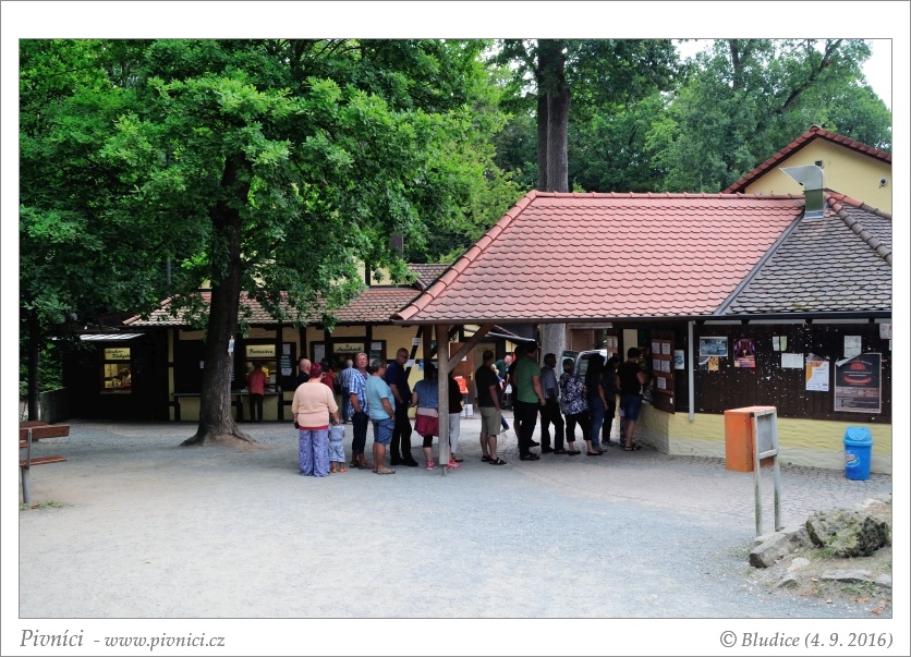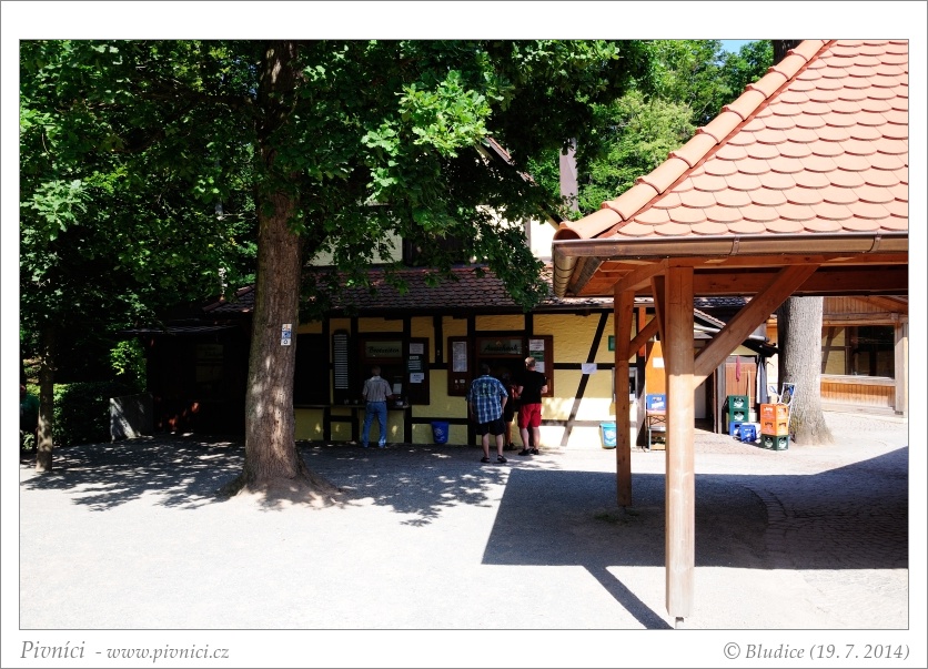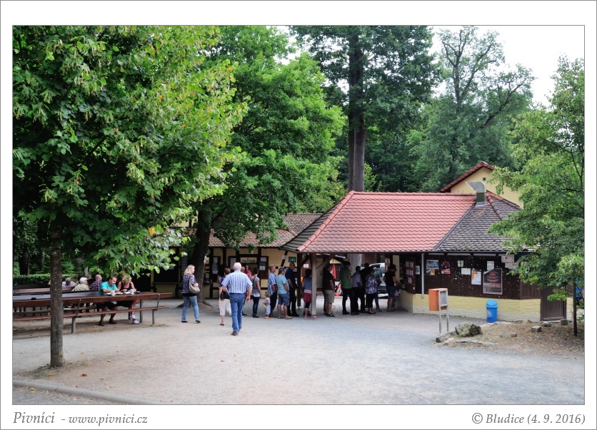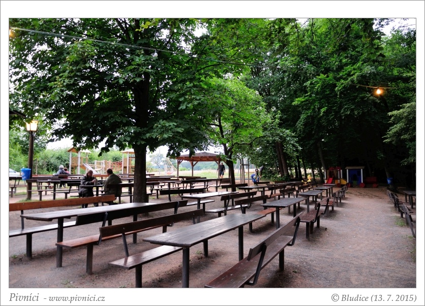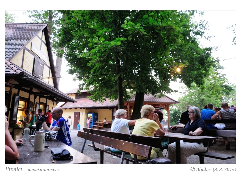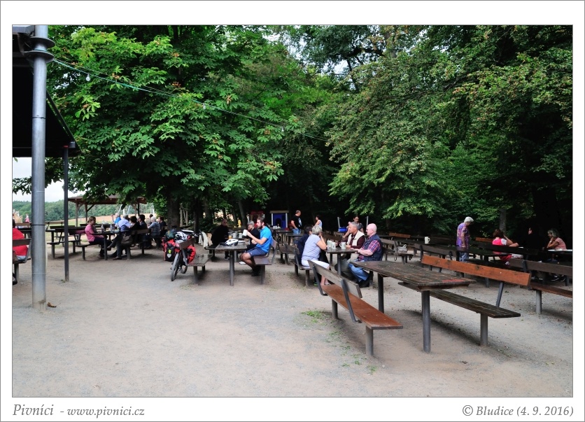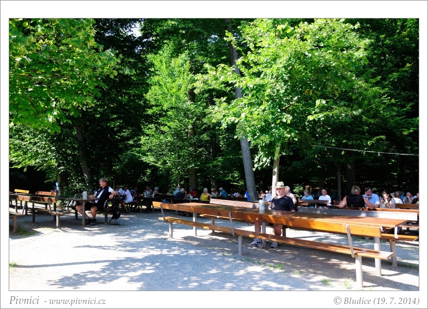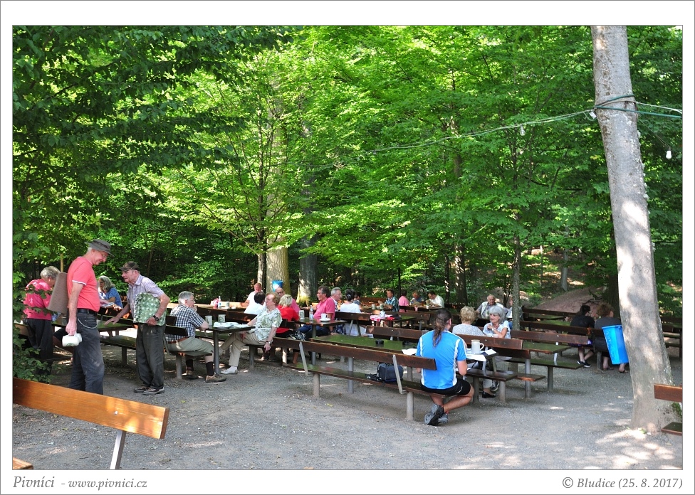 Krásná pivní zahrádka, napůl v lese, stromy poskytují příjemnou ochranu před sluncem. Vedle jsou dva pěkné domečky s výčepem a kuchyní. Je to zde plné místních, turistů spíše méně.Obsluha (4 - výborné):