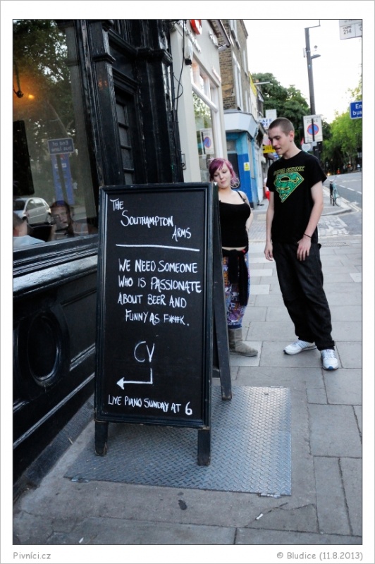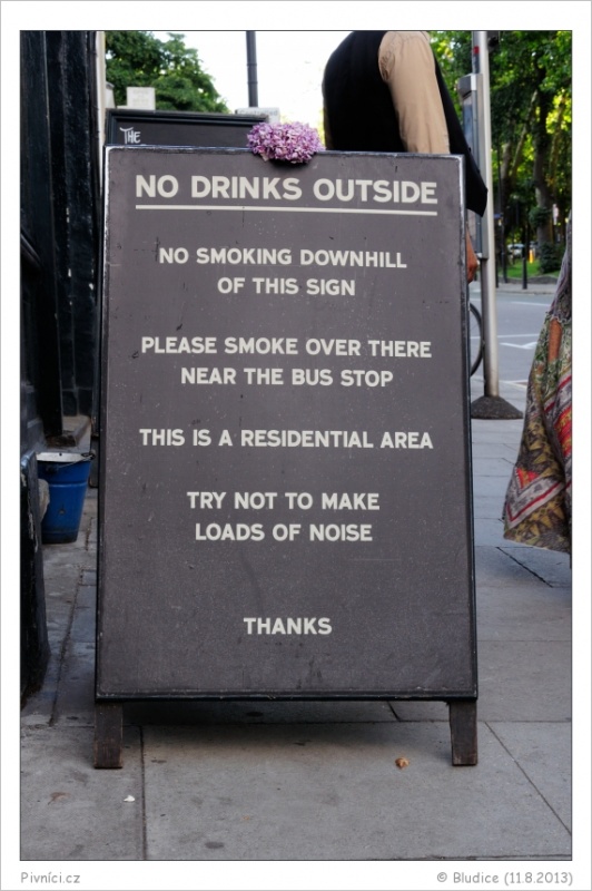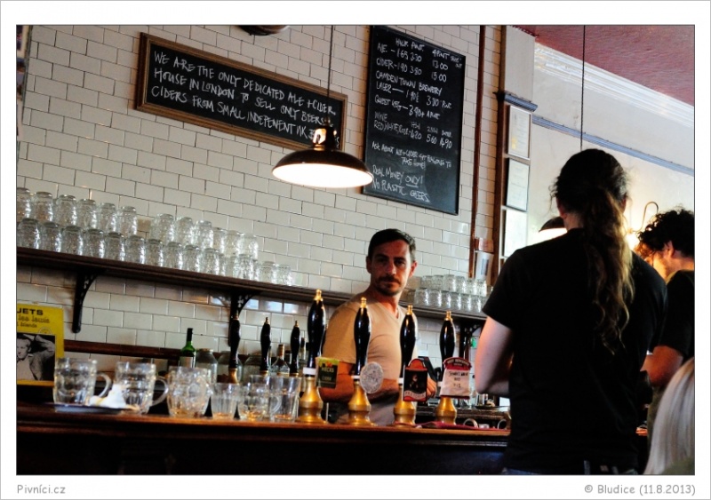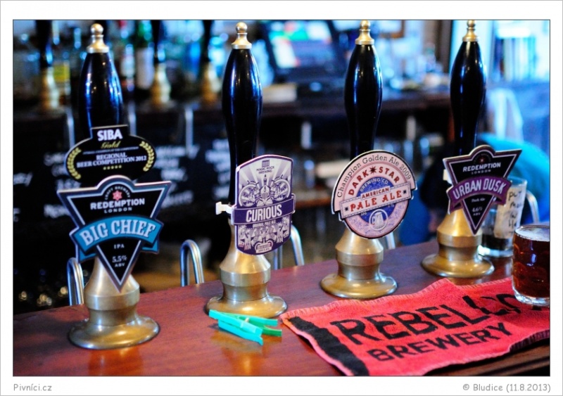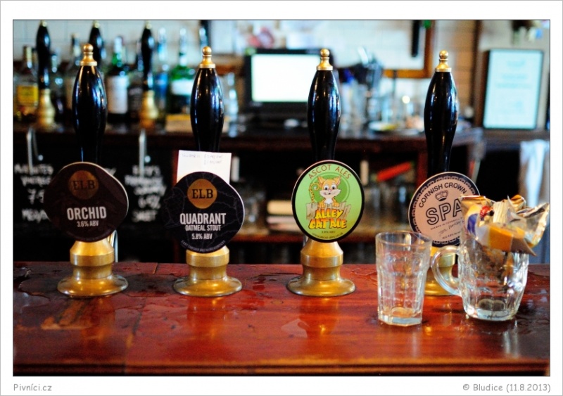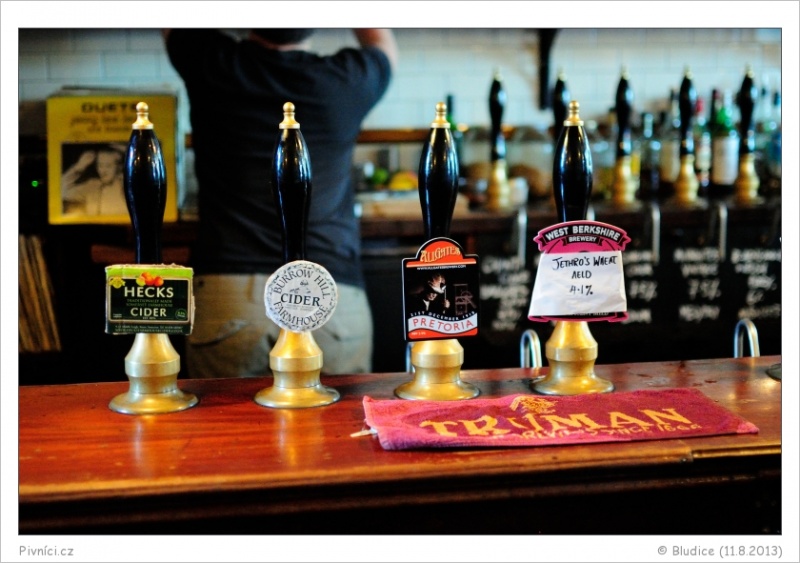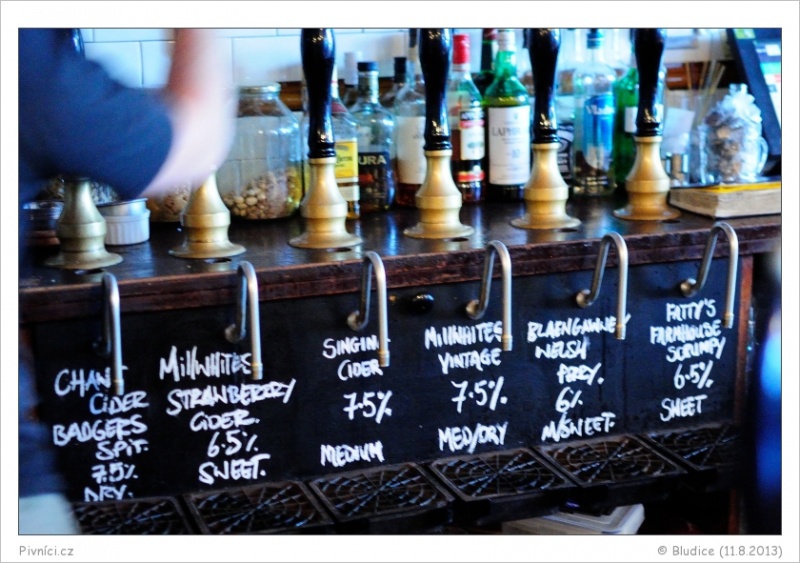 Kolem deseti Real Ale, dále osm Real Ciderů / Perry, pár kegů. Vše z malých pivovarů / farmářů z celé Anglie. Ceny příjemné, spíše nižší. Vše se servíruje ve starých ejlových buclácích, ale u lehkých piv a ciderů to zase tak moc nevadí.Celkový dojem (9 - výjimečné):