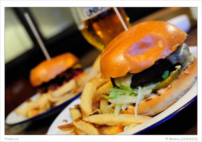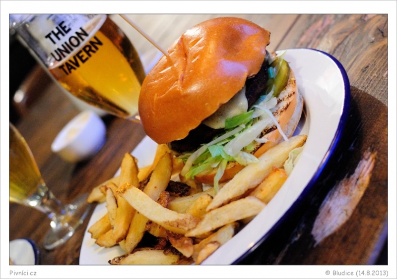Různé chuťovky a jídla, hlavně americká kuchyně, burgery, žebra, křídla. Ceny průměrné. Ochutnali jsme středeční odpolední akční burger za 5 £, hovězí a vepřový uzený. Jedlé, ale maso nudné, houska a hranolky fajn. Za ty peníze dobré, ale za více jak dvojnásobnou běžnou cenu by to bylo smutné.Pivo (3,5 - velmi dobré):