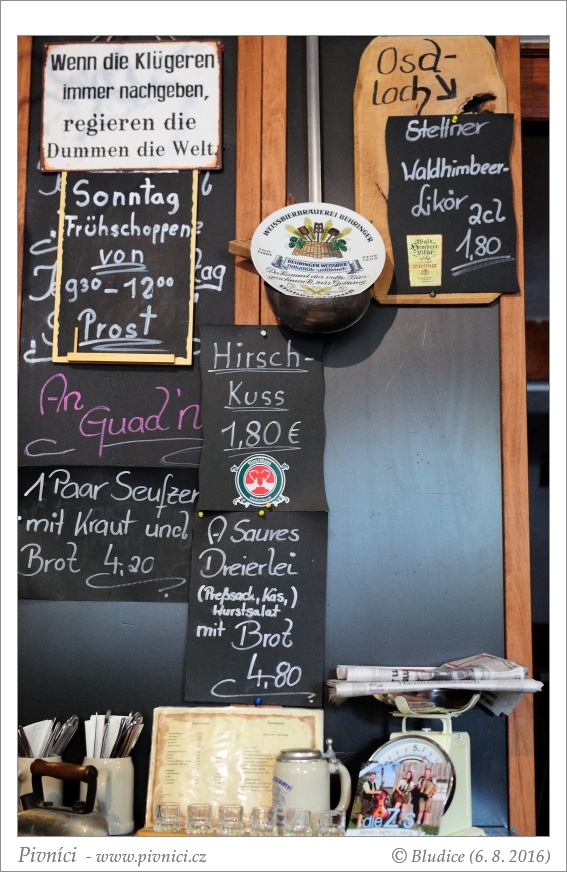 Na čepu domácí weissbier, servírovaný v kamenině (což je lepší nádoba pro pšenici než tradiční bavorská sklenice – pivo zůstává déle studené a svěží), pak ještě export helles z jiného pivovaru. Cena lehce vyšší, domácí pivo výborné.Celkový dojem (7 - velmi dobré):
