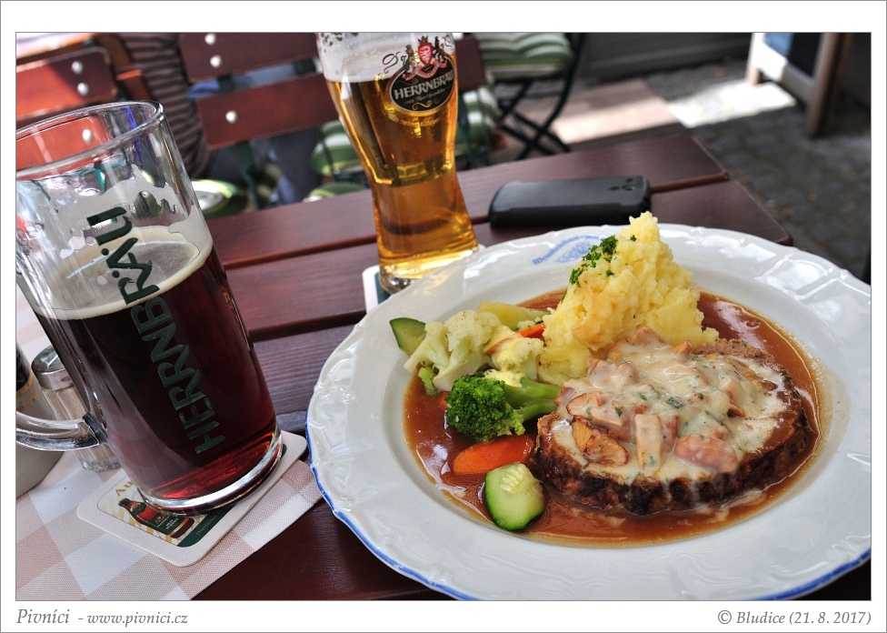 Vesměs klasická bavorská jídla, ceny průměrné až lehce vyšší. Dali jsme si sekanou s liškami, bramborovou kaší a krémovou omáčkou, bylo to velmi dobré.Pivo (3 - dobré):