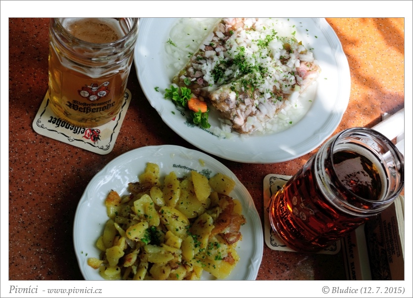 Bavorská klasika, wuřty, kolena, řízky. Ceny lehce vyšší (kromě středeční akční ceny za koleno). Dali jsme si masitou tlačenku s opečenými bramborami. Porce průměrná, jídlo chutné. Pivo (4 - výborné):