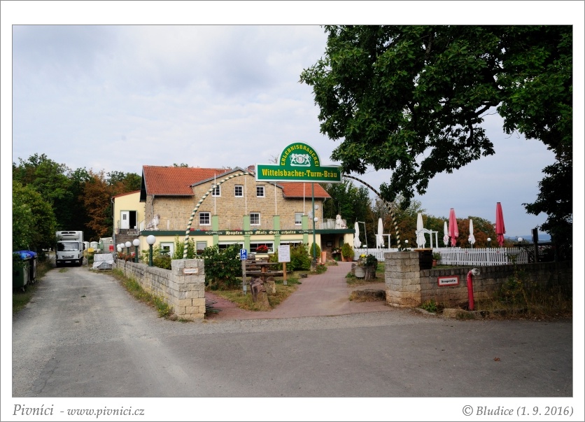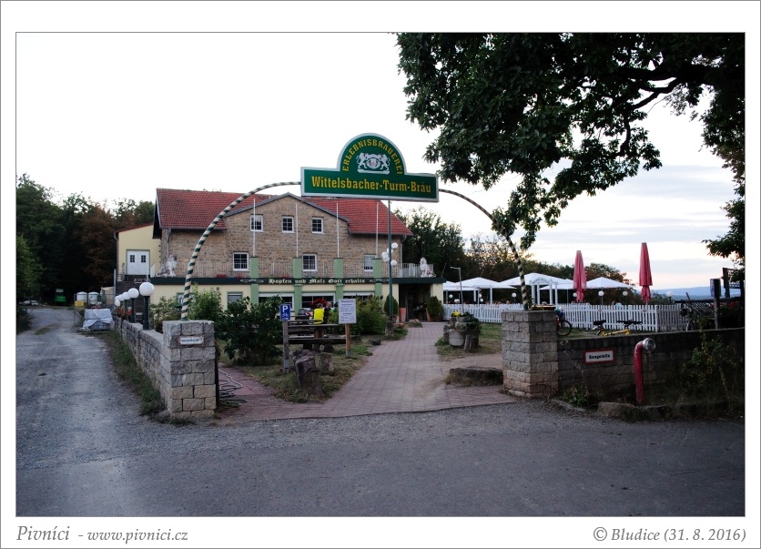 Restaurační pivovar u kamenné rozhledny Wittelsbacher Turm. Restaurace je velká, s měděnou varnou uprostřed, venku je na terase středně velká zahrádka s výhledem do kraje. Je to tu trochu takové turistické a nepříliš zajímavě zařízené, ale sedí se tu dobře.Obsluha (2,5 - lehce nadprůměr):