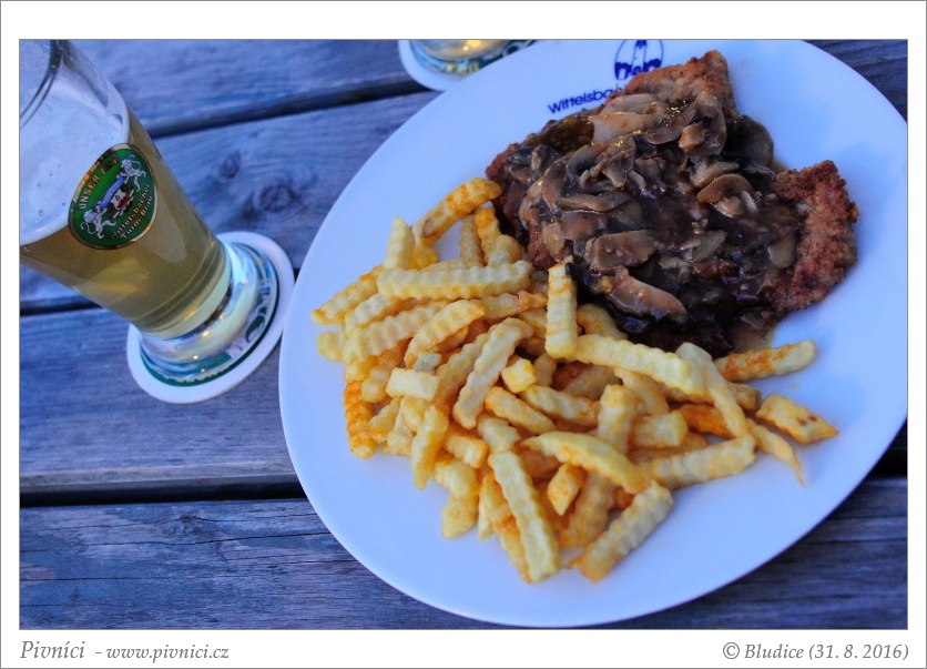 Všemožná jídla, vesměs klasická bavorská, většinou jde o masa všech druhů a úprav. Ceny průměrné. Každý všední den je k večeru v akci jiné jídlo, levnější s řadou obměn. Byl zrovna řízkový večer takže jsme si dali myslivecký řízek – klasický vídeňský, ale s houbovou omáčkou. Bylo to dobré a syté. A v nabídce je i mnoho druhů dortů a koláčů – námi ochutnaný třešňový dort se skořicí byl moc fajn.Pivo (1,5 - nedobré):