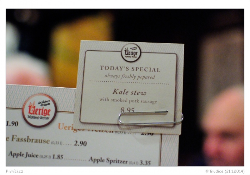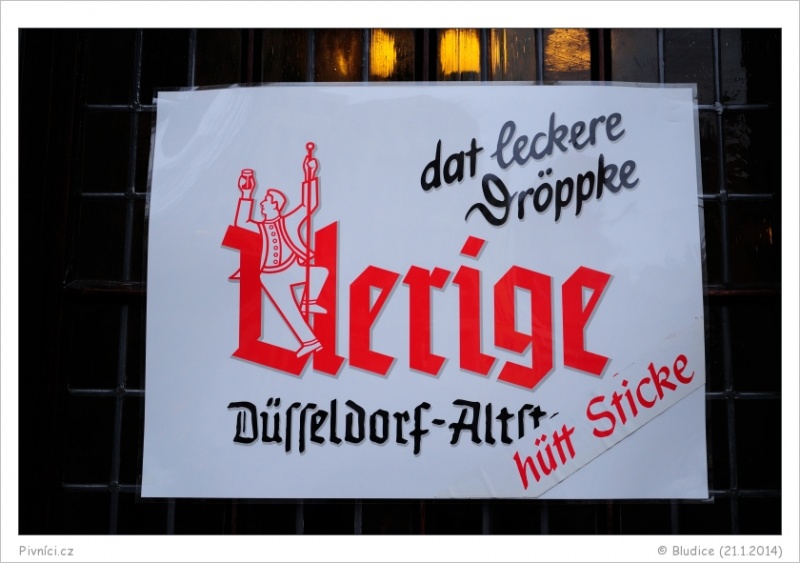Na čepu domácí Alt. Cena průměrná, pivo výtečné. A dvakrát do roka je na čepu silné Sticke místo „obyčejného“ Altu. Navíc za stejnou cenu. A je naprosto skvělé.Celkový dojem (8,5 - výborné):