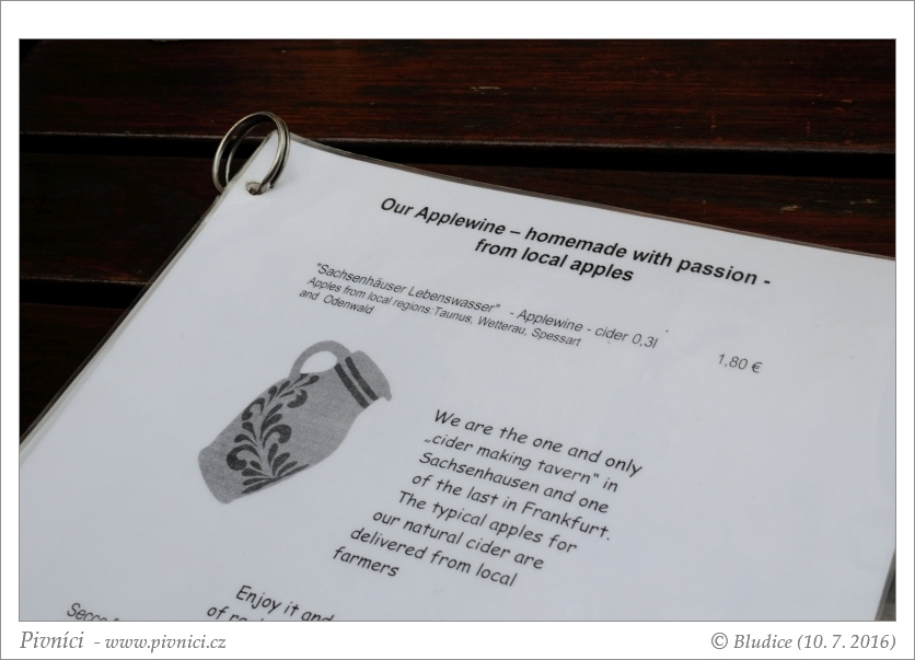 Rozlévají zde několik druhů apfelweinů, tedy ciderů – dva domácí a dva hostující z Kelterei Elm, plus jeden domácí perlivý v láhvi. Ceny průměrné, domácí cidery moc fajn, hostující ujdou. Domácí základní cider je možné si dát ve více lidech v džbánu (bembel) a postupně pak rozlévat (není totiž perlivý).Celkový dojem (7 - velmi dobré):