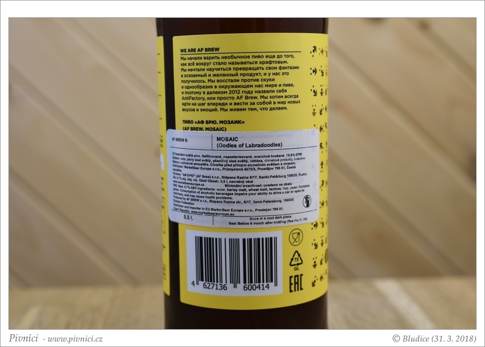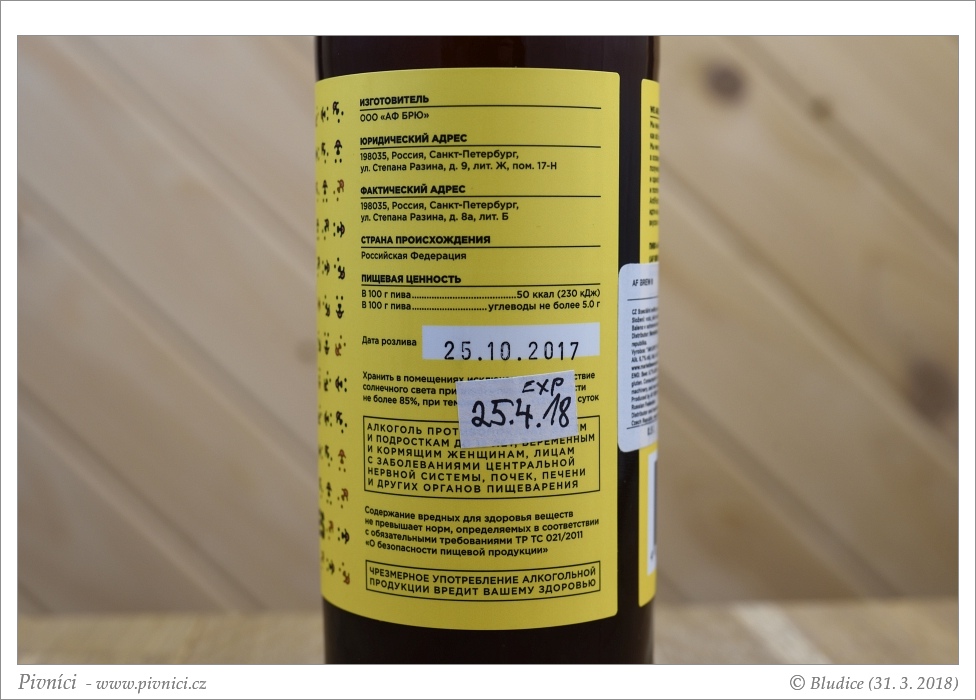 Slámová barva, velmi zakalené (odpočívalo v klidu lednice více než týden). Pěkná světlá pěna, dobře drží.Vůně (4 - výborné):