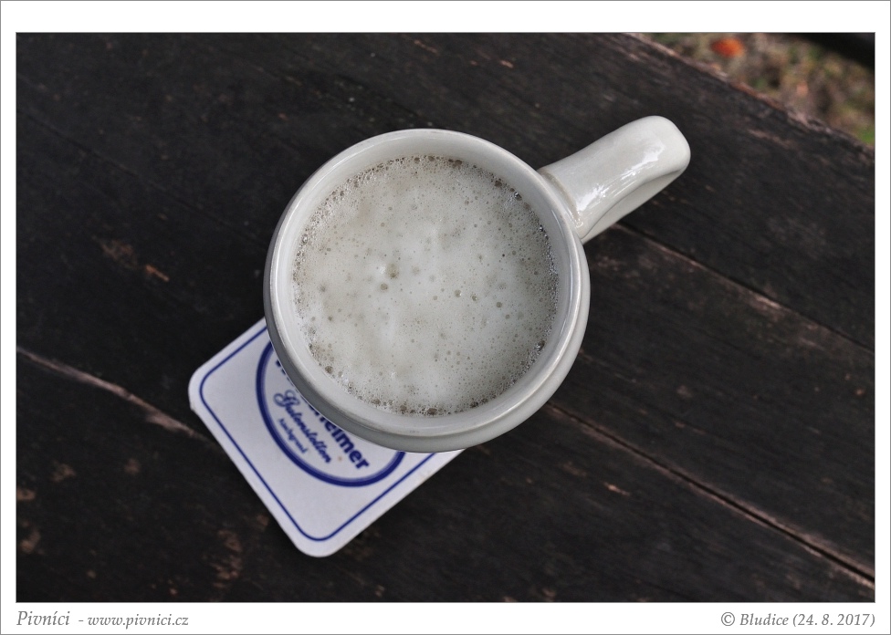 V kamenině, slušná světlá pěna, dobře drží. Barva asi měděná, zdá se čiré.Vůně (3,5 - velmi dobré):