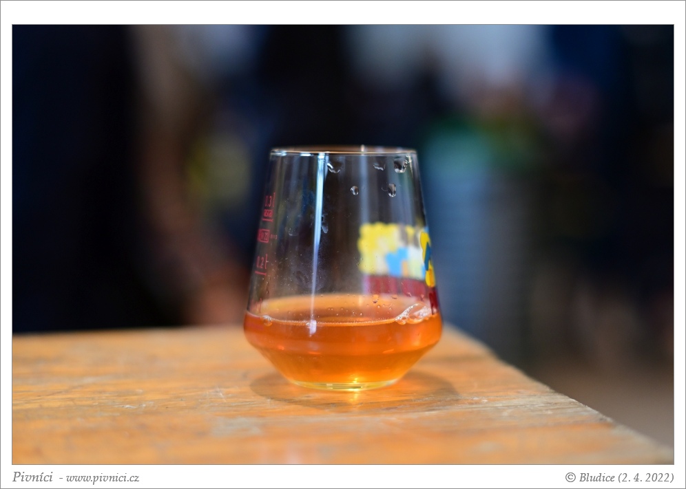 Zlatá až oranžová barva, lehce až středně zakalené. Prakticky bez pěny.Vůně (3 - dobré):