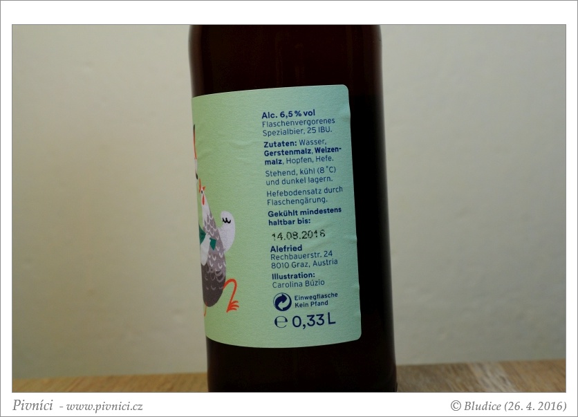 Výrazněji kořeněné pivo s příjemnou šumivostí. Velmi dobře se popíjí.Minimální trvanlivost: 14. srpna 2016