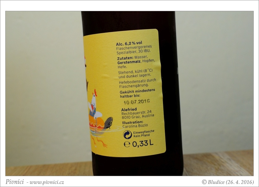 Ne úplně čisté pivo, kvasinky v něm trochu ruší a vyšší říz by mu prospěl. Ale jinak je čerstvé a pije se dobře. Minimální trvanlivost: 10. července 2016