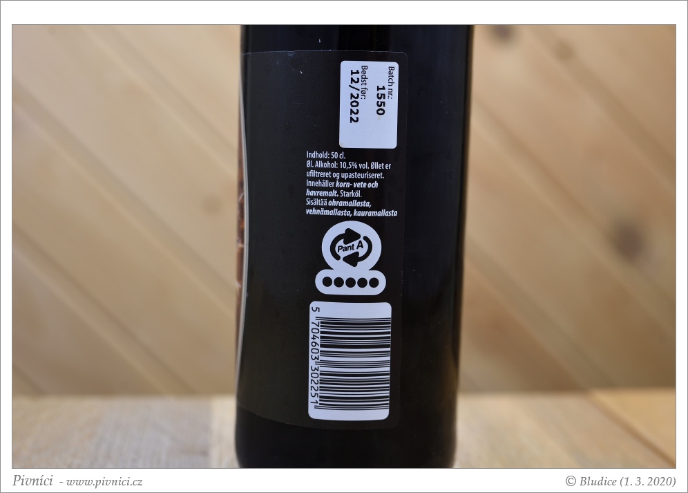 Nižší jemný říz, vysoká plnost. V chuti karamelové, s tóny hořké čokolády, lesního medu, nádechem rozinek, výrazně tóny bourbonu, kokosů a vanilky. Hořkost je střední. Doznívání je dlouhé a výrazné, s tóny bourbonu, vanilky, kokosu, hořké čokolády, lesního medu a alkoholu. Alkoholová hřejivost na závěr. Jemná krémová struktura.Celkový dojem (9 - výjimečné pivo):