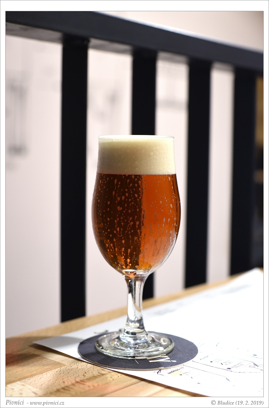 Měděná barva, čiré. Pěkná světlá pěna s okrovým nádechem, dobře drží.Vůně (3 - dobré):