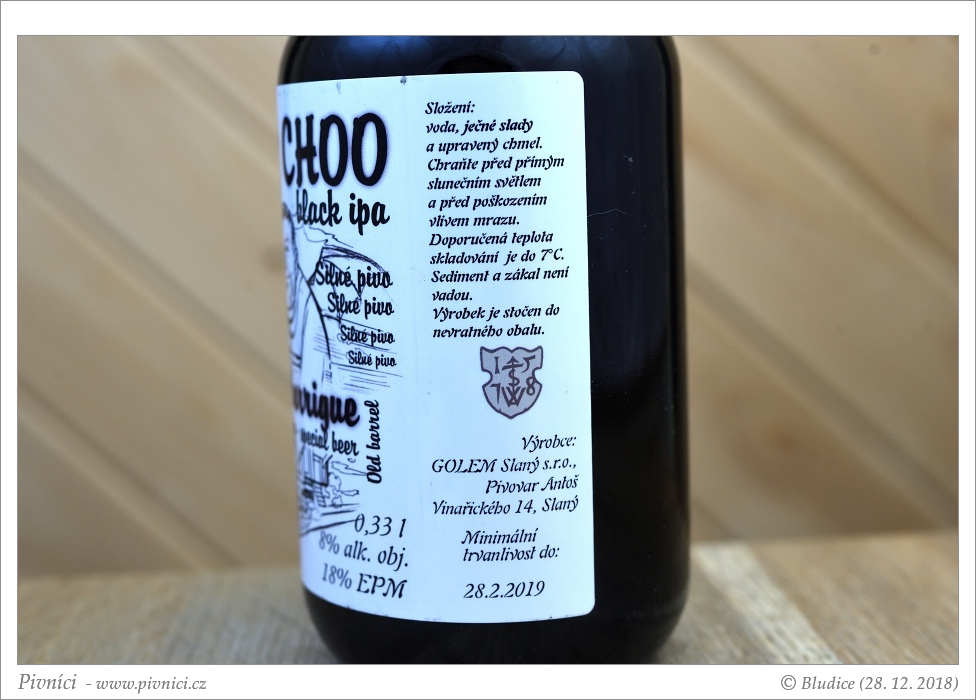 Ebenová až úplně černá barva, téměř čiré. Slušná světlá pěna s béžovým nádechem, celkem drží.Vůně (3 - dobré):