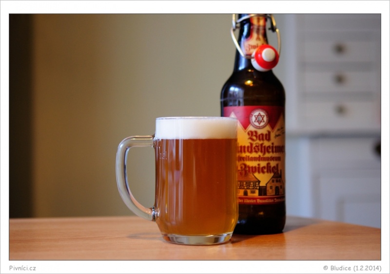 Zlatá barva, lehce zakalené, slušná bílá pěna, skvěle drží, lehce kroužkuje.Vůně (3,5 - velmi dobré):