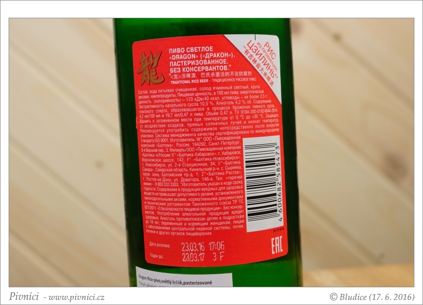 Střední jemný říz, nízká plnost. V chuti lehce sladové, nasládlé. Hořkost je nižší prakticky bez chuti chmele. Doznívání je nasládlé, s lehkým nádechem rýže.Celkový dojem (4 - průměrné pivo):