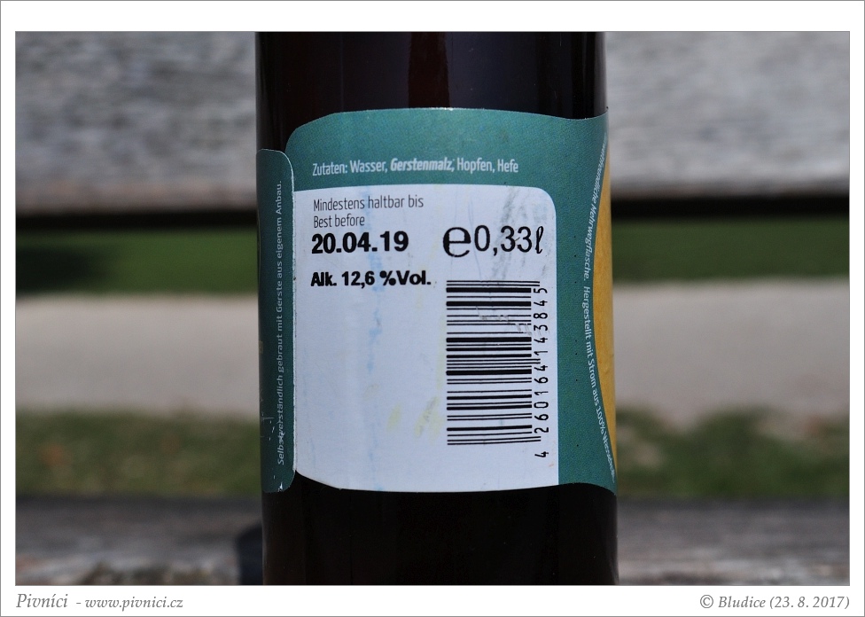 Zlatá barva, prakticky čiré, slušná světlá pěna, dobře drží.Vůně (4 - výborné):