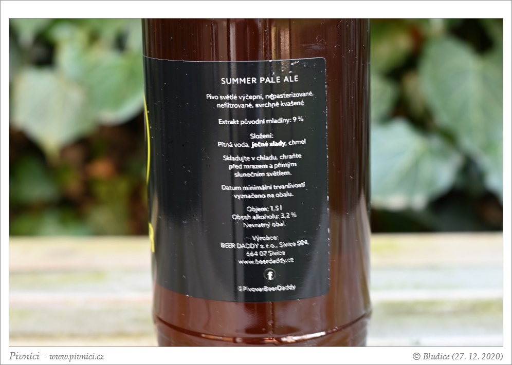 Zlatá barva, téměř čiré. Pěkná světlá pěna, dobře drží.Vůně (2,5 - lehce nadprůměr):