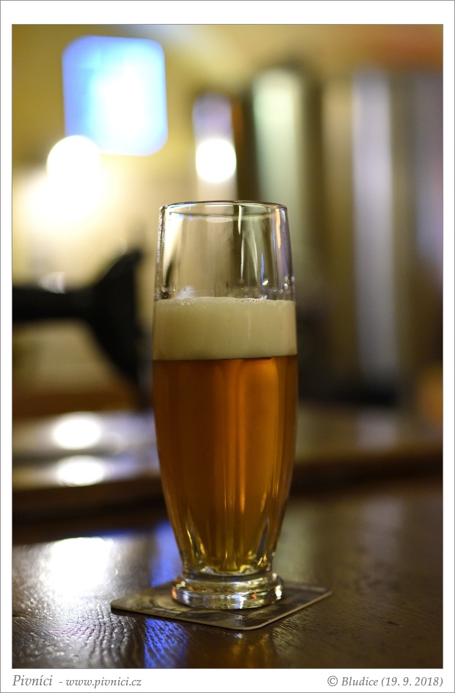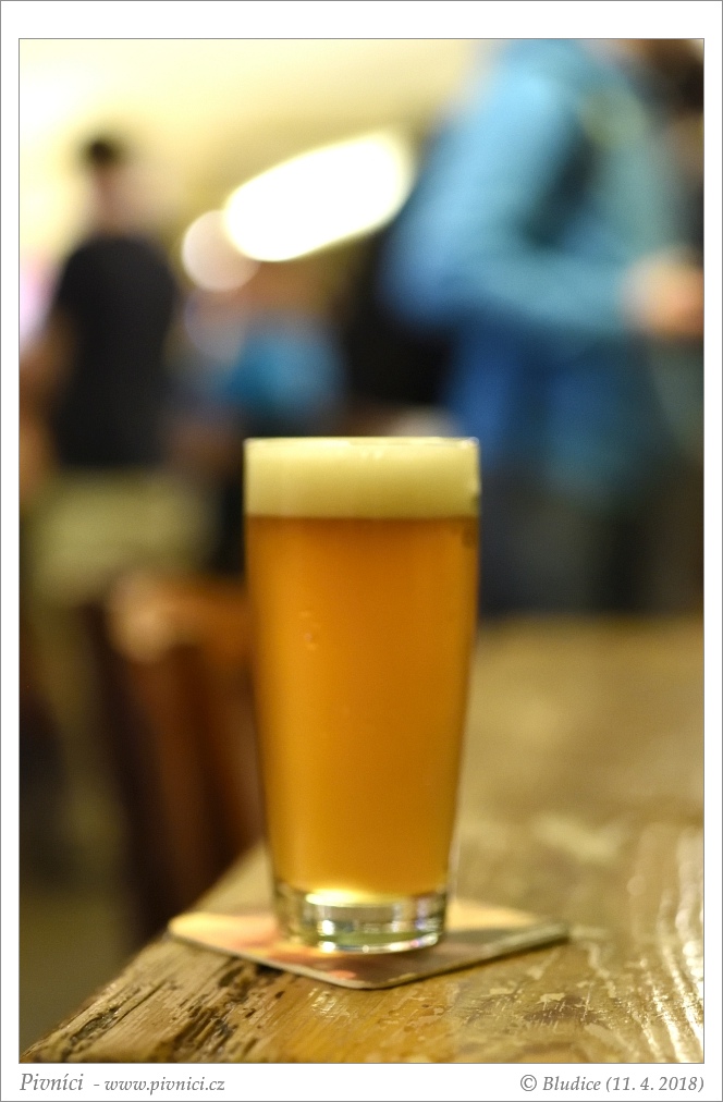 Zlatá barva, lehce zakalené, pěkná světlá pěna, dobře drží.Vůně (2,5 - lehce nadprůměr):