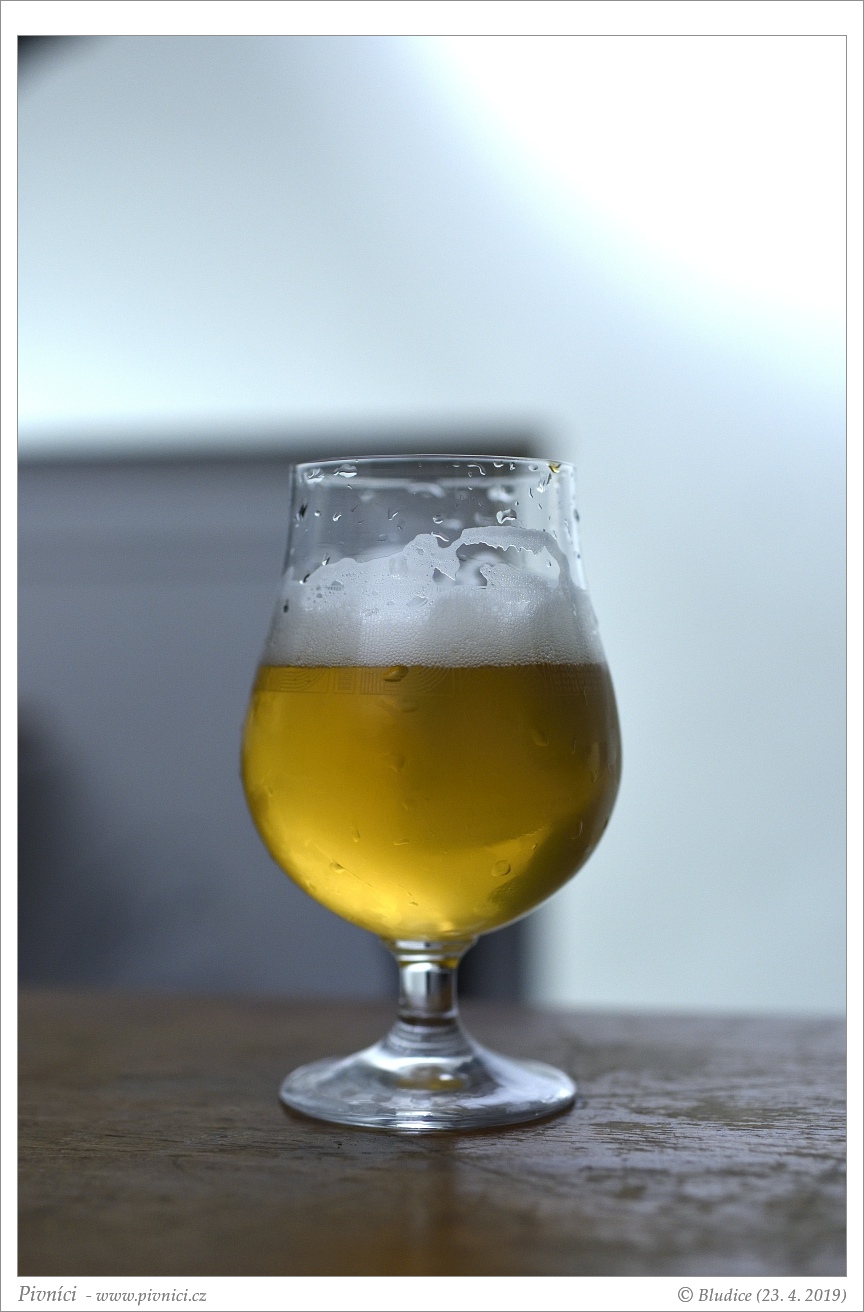 Zlatá barva, téměř čiré. Pěkná světlá pěna, dobře drží.Vůně (3,5 - velmi dobré):