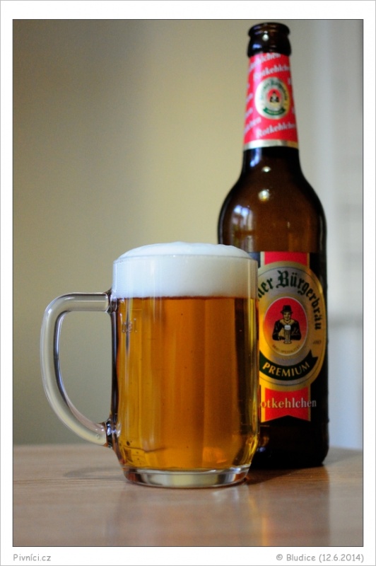 Zlatá barva, čiré, slušná bílá pěna, průměrně drží.Vůně (2,5 - lehce nadprůměr):