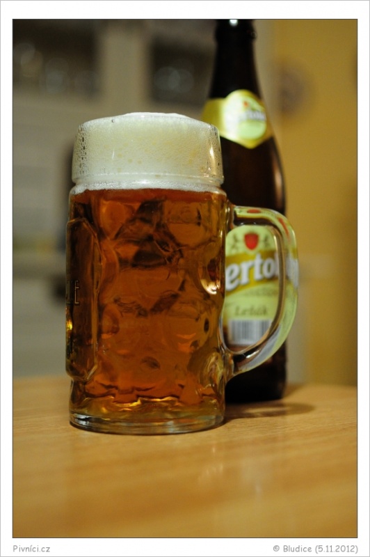 Zlatá barva, čiré, slušná bílá pěna.Vůně (3 - dobré):