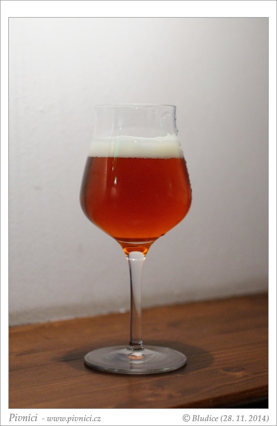 Měděná barva, téměř čiré, pěkná bílá pěna, hezky drží.Vůně (4 - výborné):