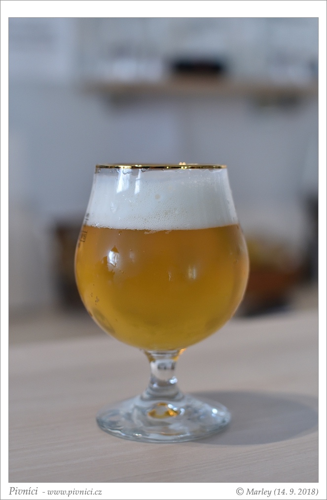Zlatá barva, lehce zakalené. Pěkná světlá pěna, dobře drží, slušně kroužkuje.Vůně (2,5 - lehce nadprůměr):