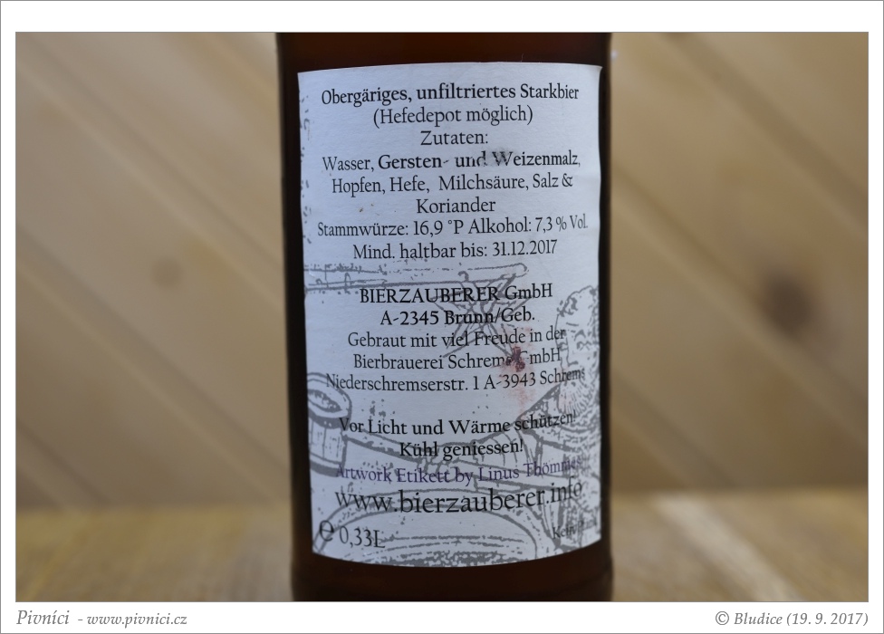 Zlatá barva, lehce zakalené, pěkná vyšší světlá pěna, dobře drží.Vůně (3,5 - velmi dobré):