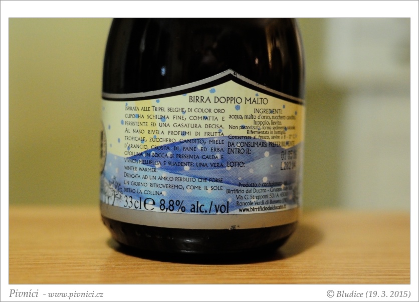 Vynikající tripel, krásně vyvážený s lehkou nakyslostí, která příjemně vyrovnává sladkost. Skvěle se popíjí.Minimální trvanlivost: 1. května 2016