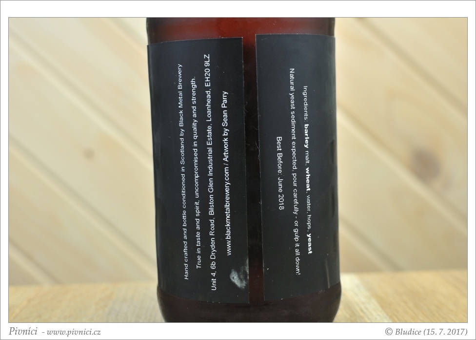 Zlatá barva, téměř čiré (odpočívalo přes měsíc v lednici, chvíli trvalo, než se vyčeřilo). Pěkná světlá pěna, slušně drží.Vůně (4 - výborné):