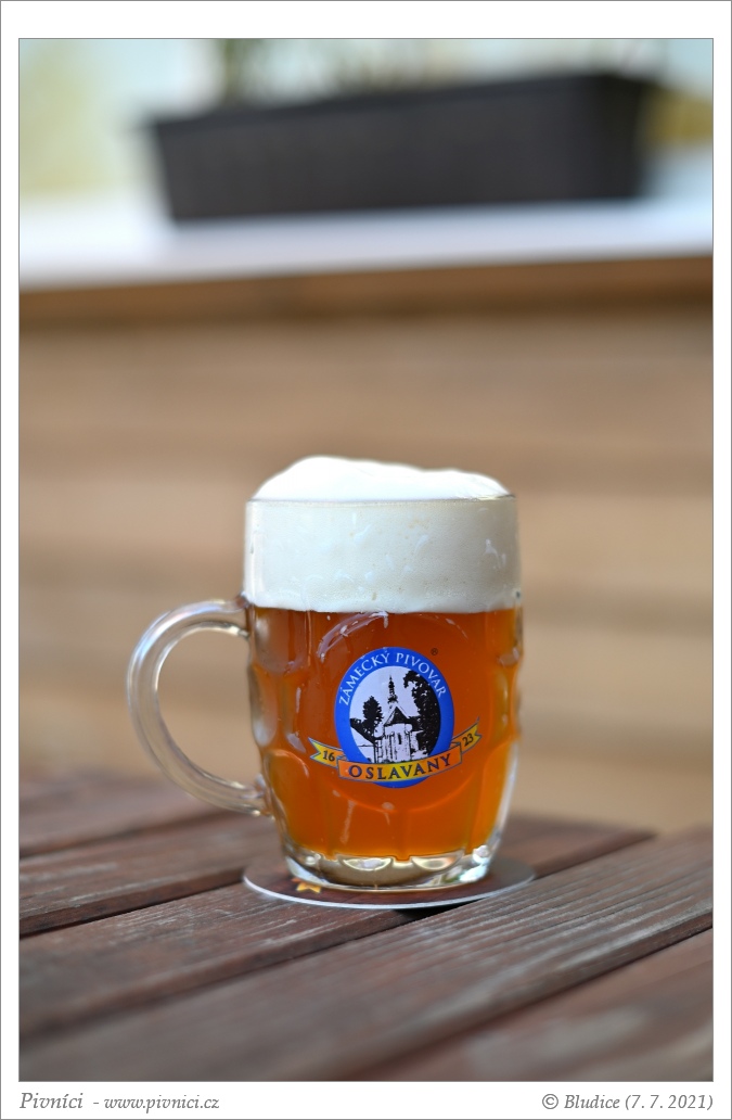 Zlatá barva, velmi lehce zakalené, pěkná bílá pěna, slušně drží.Vůně (2 - průměr):