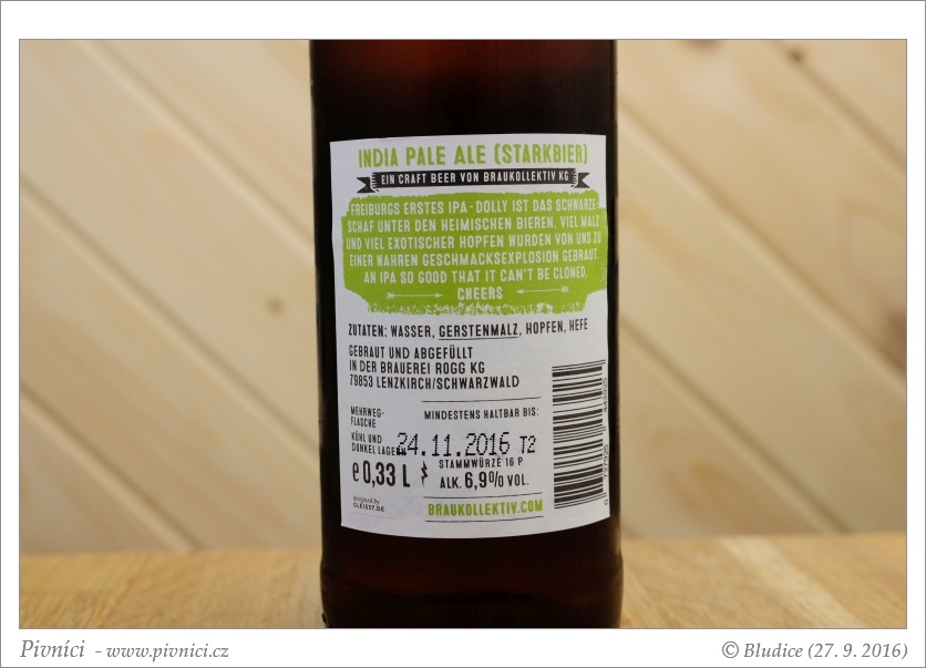 Výborné, výrazně chmelené pivo. Skvěle se popíjí.Minimální trvanlivost: 24. listopadu 2016
