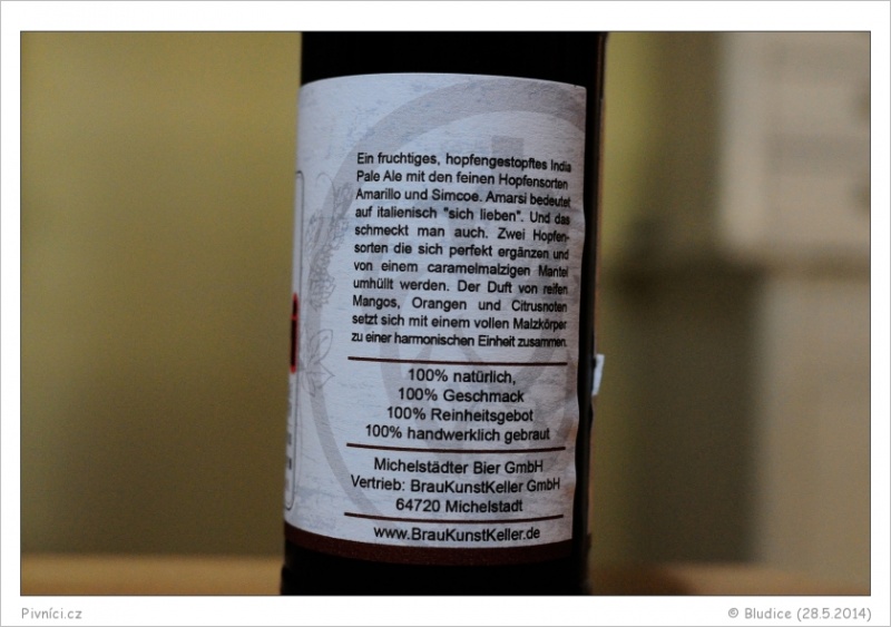 Příjemná a moc hezky nachmelená IPA. Je trochu sladší, připomíná piva z Beskydského pivovárku.Vzhled (4 - výborné):
