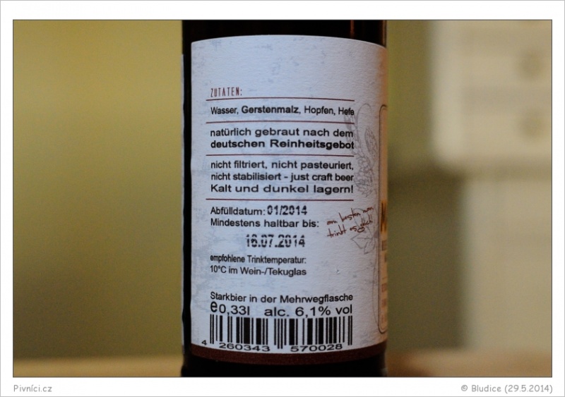 Výborné a pěkně vyvážené pivo. Zajímavá kombinace chutí.Minimální trvanlivost: 16.7.2014