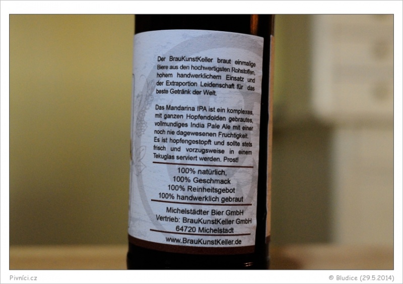 Zlatá barva, čiré, pěkná bílá pěna, slušně drží.Vůně (4 - výborné):