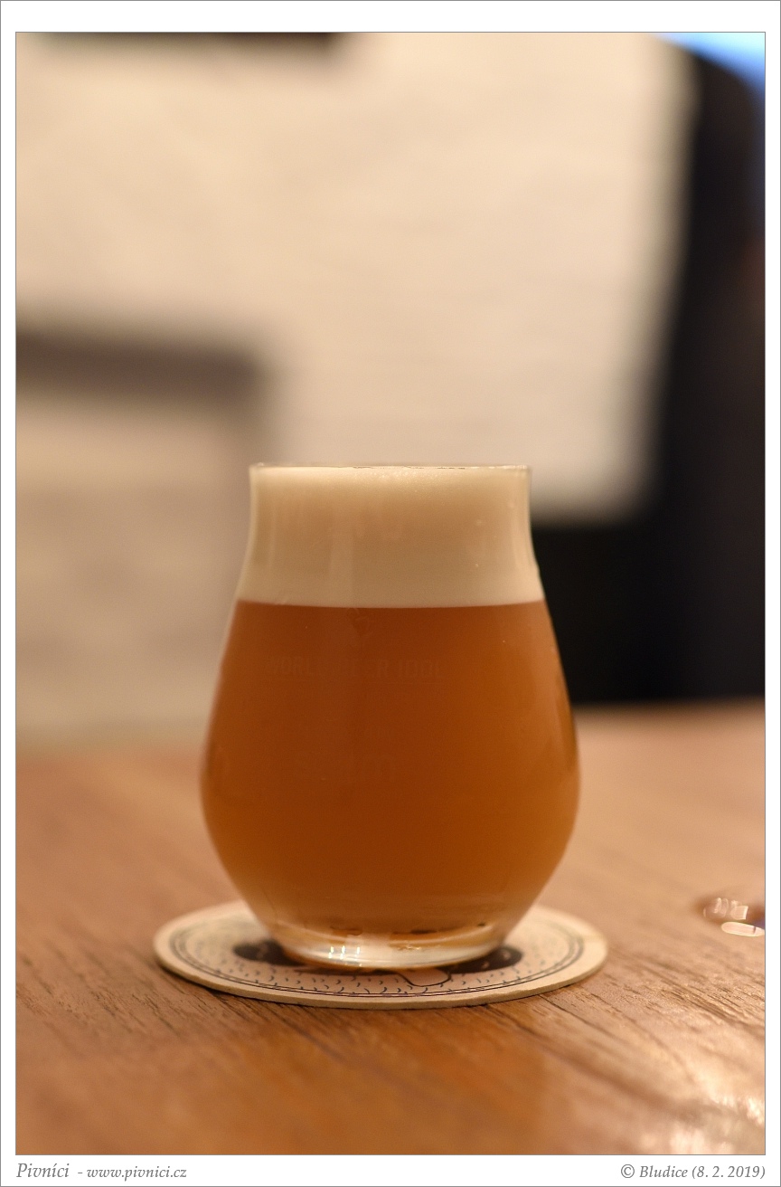 Zlatá barva, velmi zakalené. Pěkná světlá pěna, dobře drží, hezky kroužkuje.Vůně (3,5 - velmi dobré):